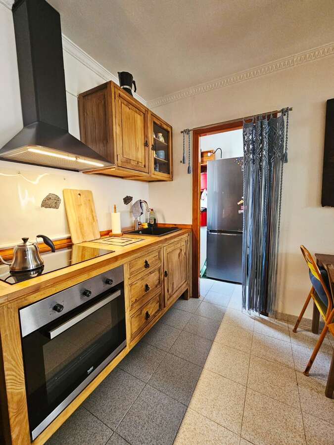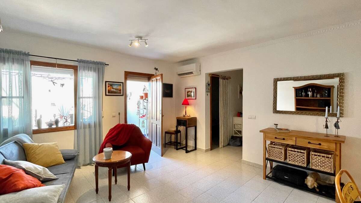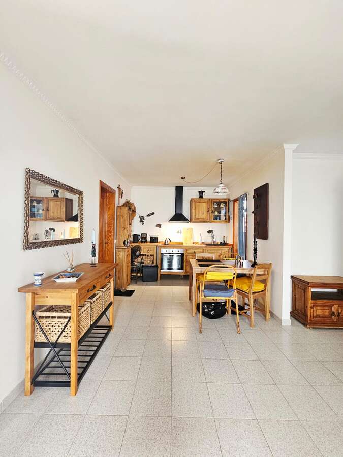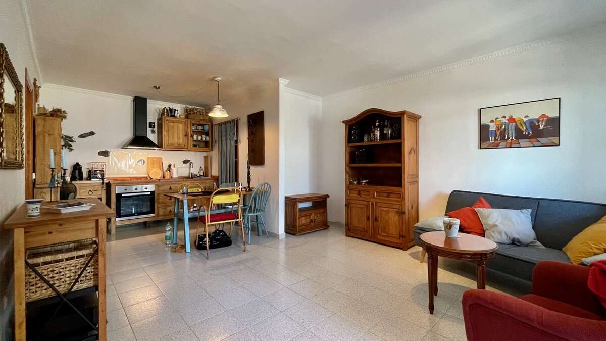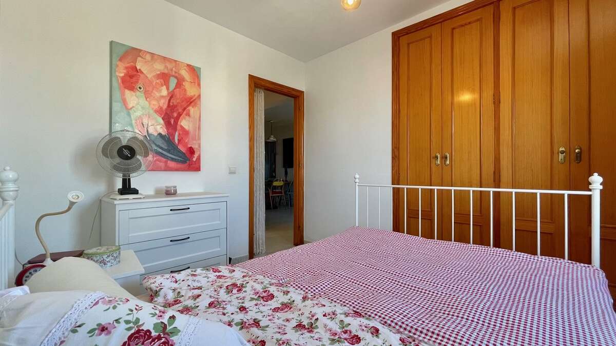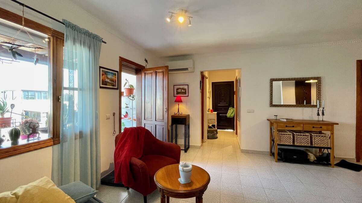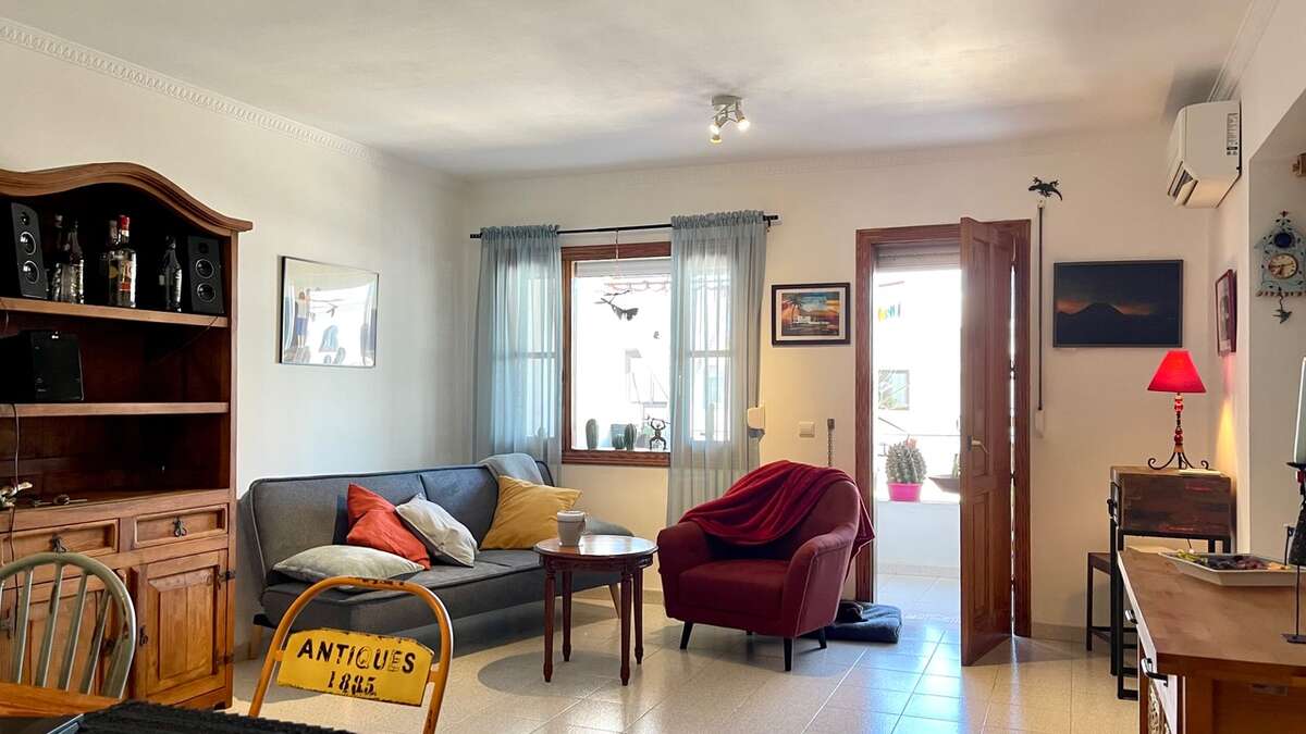 The apartment is situated on the upper floor and impresses with its excellent condition and charming, cozy atmosphere. It features two bright double bedrooms with built-in wardrobes; a renovated bathroom with a walk-in shower; a spacious living-dining area with air conditioning; and an open Mexican-style kitchen fitted with custom-made freestanding furniture and an adjoining utility room.