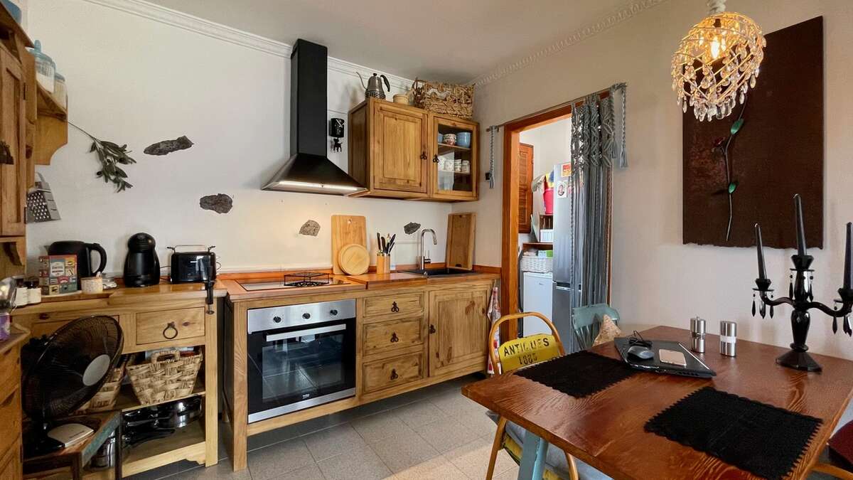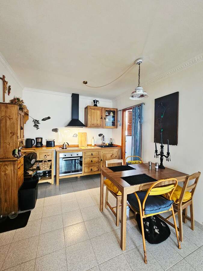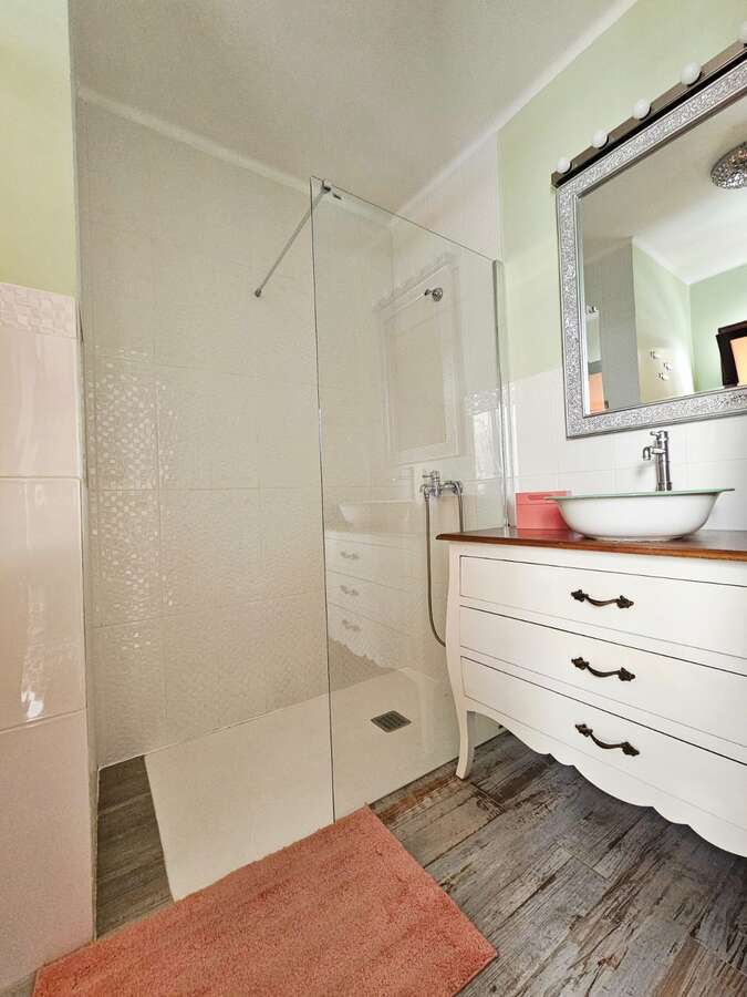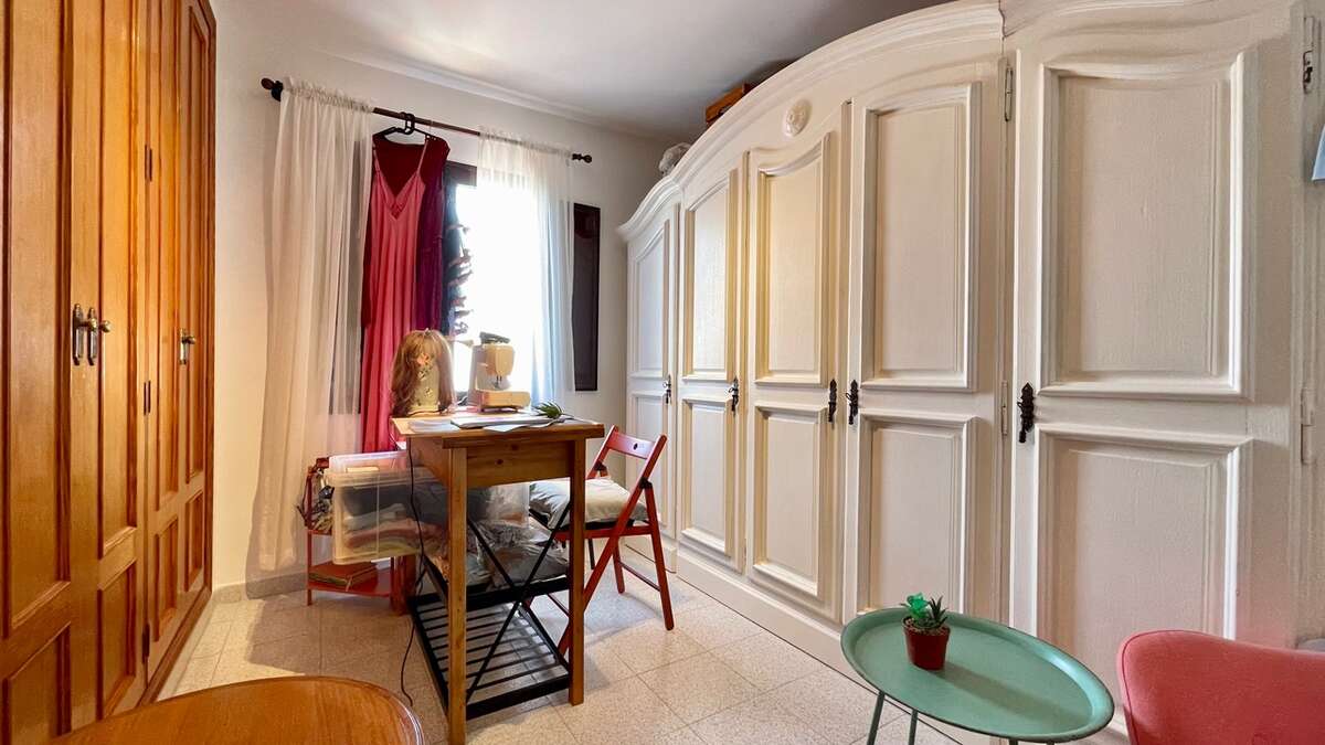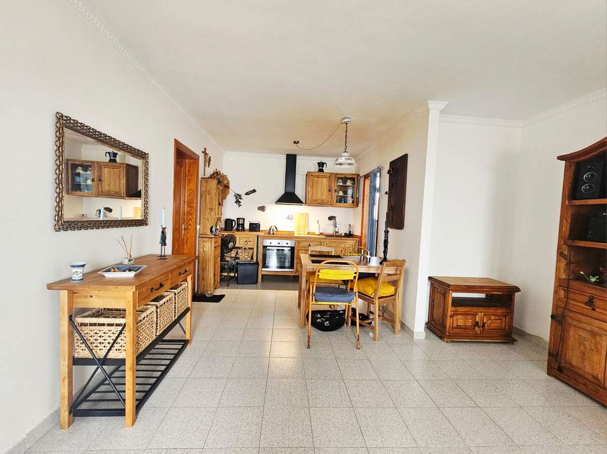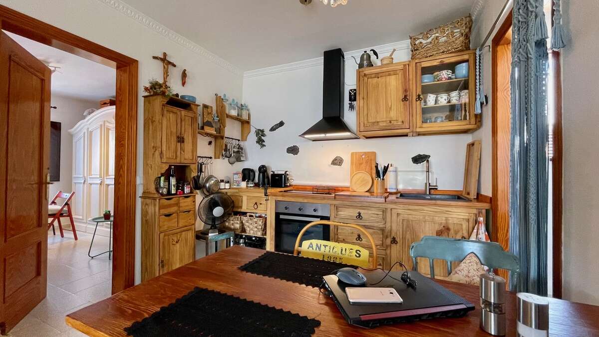 The apartment is situated on the upper floor and impresses with its excellent condition and charming, cozy atmosphere. It features two bright double bedrooms with built-in wardrobes; a renovated bathroom with a walk-in shower; a spacious living-dining area with air conditioning; and an open Mexican-style kitchen fitted with custom-made freestanding furniture and an adjoining utility room.