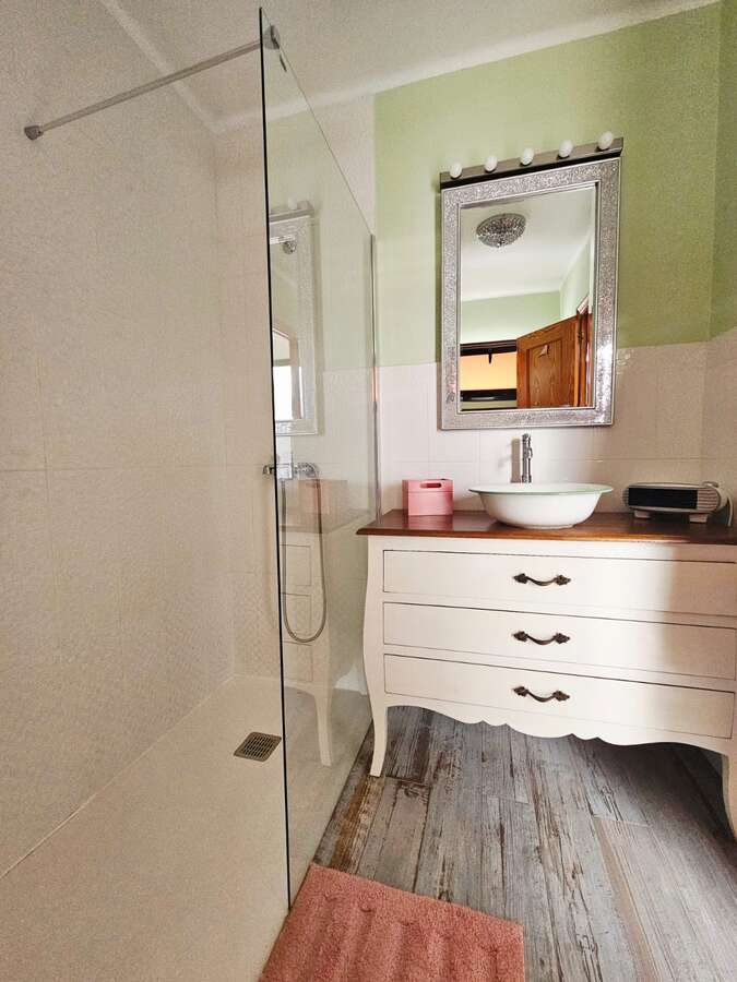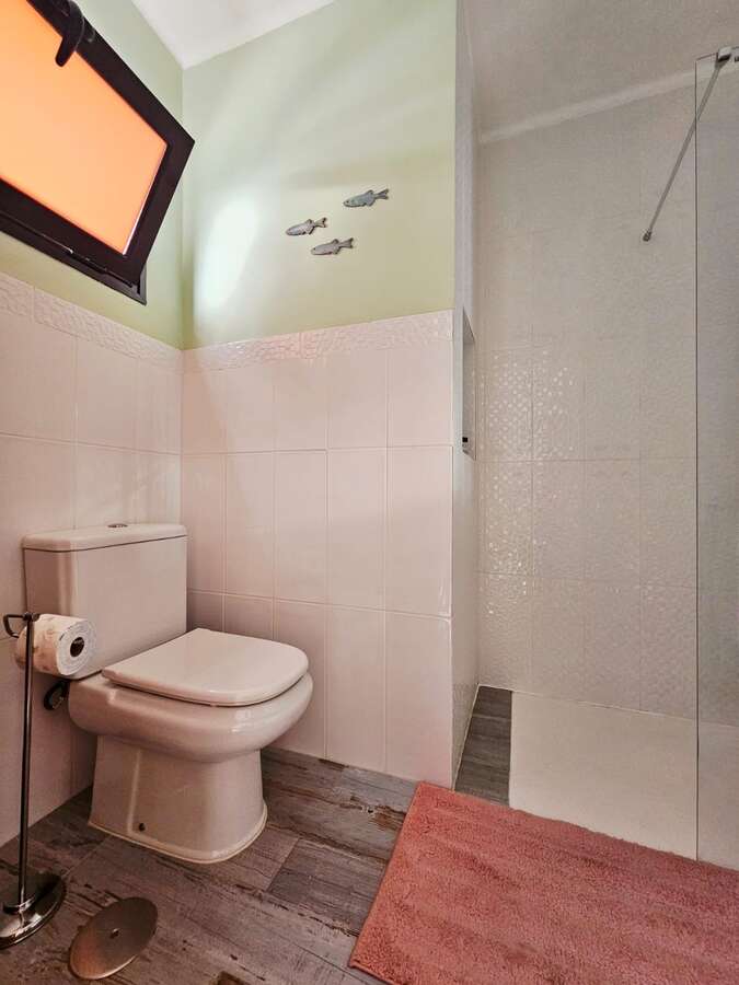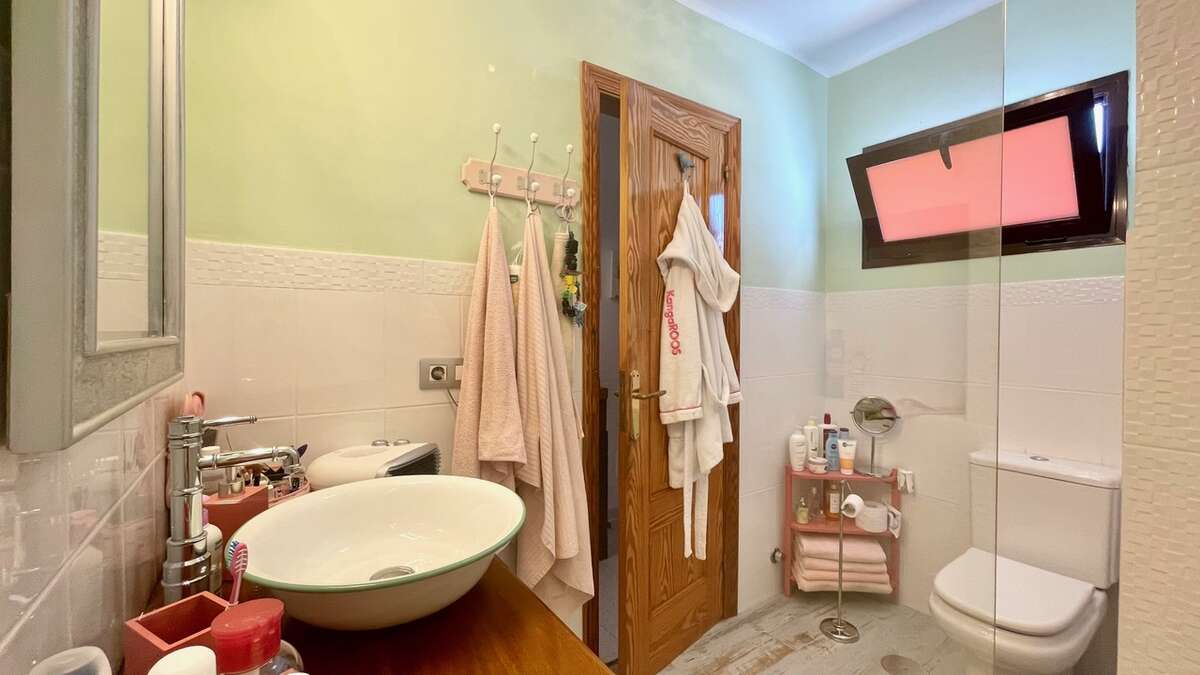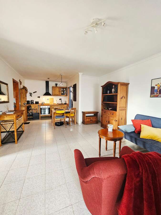 The apartment is situated on the upper floor and impresses with its excellent condition and charming, cozy atmosphere. It features two bright double bedrooms with built-in wardrobes; a renovated bathroom with a walk-in shower; a spacious living-dining area with air conditioning; and an open Mexican-style kitchen fitted with custom-made freestanding furniture and an adjoining utility room.