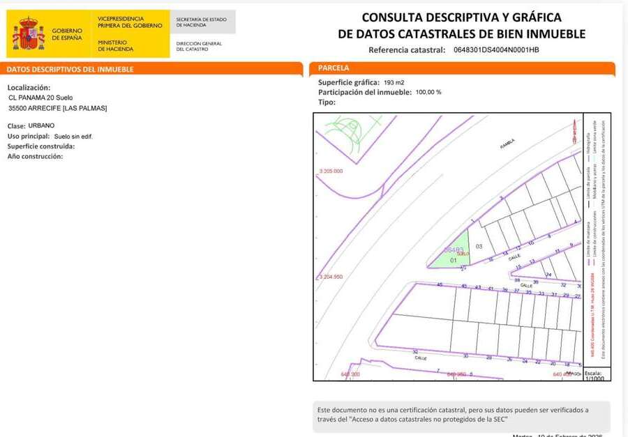 Se vende terreno urbano en Arrecife, en la zona de Vía Medular, haciendo esquina con la calle Paraná. La parcela cuenta con una superficie de 193 m² y dispone de dos fachadas, a Vía Medular y calle Panamá, lo que le aporta gran visibilidad y excelentes posibilidades de edificación.
